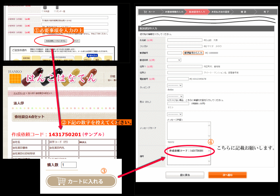 配送設定の入力画面、【備考】の欄に「作成依頼コード」の記載をお願いします。